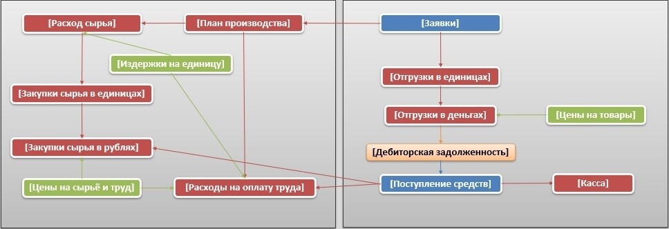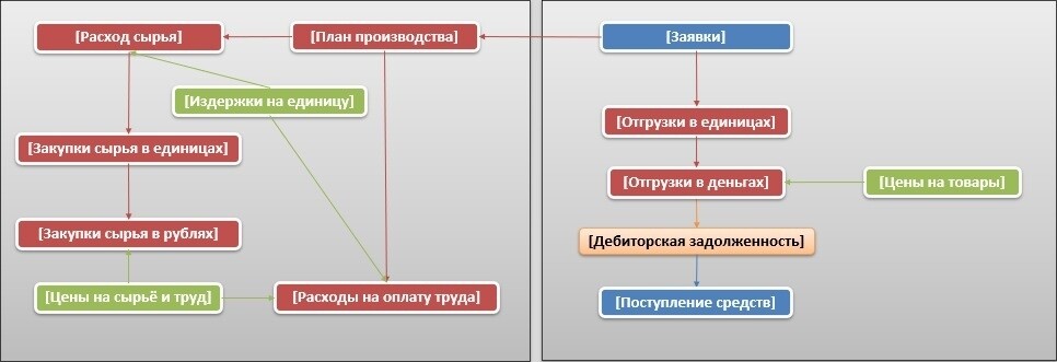 Но теперь перейдём ко второй части этой (намеренно упрощённой) схемы. Пришедшие заявки (принятые к исполнению) означают и то, что со склада должна уйти готовая продукция, а на её место произведена новая продукция для следующих продаж (если вы конечно не собираетесь распродать склад, положить деньги на счёт, уехать на лазурный берег, поставить статус в соцсетях “счастлив” и больше никогда не появляться онлайн. Но в таком случае зачем бы вам читать эту статью?) Таким образом, пришедшие заявки превращаются (ещё раз - в нашей упрощённой схеме) в план производства новой партии продукции компании. А имея данные о том, сколько какого сырья нужно на производство того или иного продукта, мы получаем и таблицу расхода сырья. Если мы знаем сколько нам нужно произвести продукции и сколько для каждой из них нужно сырья и материалов, то, зная цены на сырьё, мы можем получить сумму, которая нам нужна на закупку сырья. Аналогично дело обстоит и с расходами на оплату человеко-часов.