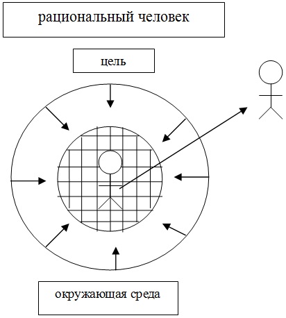 Вебер описывает другую схему взаимодействия. В ней тоже есть окружающая среда, но схема тут уже двойная. Сначала человек выносится из окружающей среды и смотрит на нее как бы со стороны. Посмотрев снаружи, из идеальной позиции (речь, в некотором смысле, идет об идеальном человеке в противоположность натуральному – он смотрит из идеальной позиции), глазами бога (вы помните, мы на прошлой лекции говорили, что он, в некотором роде, сам ощущает себя маленьким богом: бог смотрит на весь мир, а я не могу посмотреть на весь мир, но на маленький кусочек мира посмотреть могу ‒ как бы со стороны, как бы взглядом бога), выбирает те внешние воздействия, с которыми он будет взаимодействовать, потом помещает себя обратно в окружающую среду, но вокруг себя выстраивает некую систему взаимодействия с теми явлениями окружающего мира, которые он сам выбрал, а остальные просто игнорирует. То есть между ним и окружающей средой возникает некое рационализированное окружение (оно рационализированное, потому что я же подражаю богу, когда строю свою жизнь ‒ бог устроил мир рационально, и я строю свой мир рационально, насколько могу). И человек взаимодействует с окружающей средой только через вот эту искусственную среду, через фильтр, который сам создал и определил.